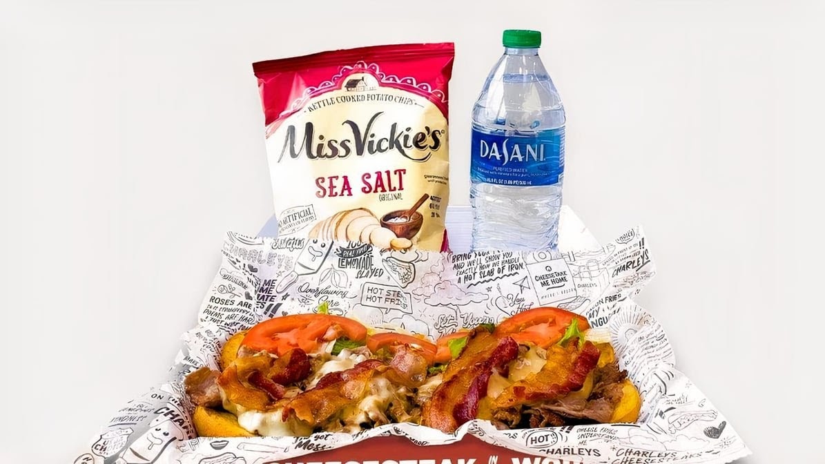 Charleys Bacon 3 Cheesesteak Boxed Meal includes a cheesesteak made with USDA choice steak, crispy bacon, and melted provolone, Swiss, and cheddar cheese served on our signature toasted roll and topped with fresh lettuce and tomato. Mayo packets are provided on the side. Consider adding Miss Vickie's Chips, Dasani bottled water, and a Chocolate Chunk Cookie to complete your meal.