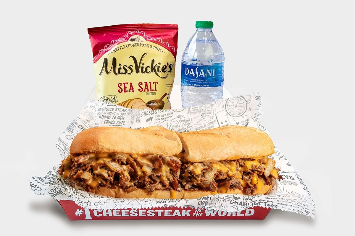 Charleys Old School Cheesesteak Boxed Meal includes an old school cheesesteak made with loaded extra grilled USDA-choice steak, Cheez Whiz®, and sautéed onions on a toasted roll. Consider adding Miss Vickie's Chips, Dasani bottled water, and a Chocolate Chunk Cookie to complete your meal.